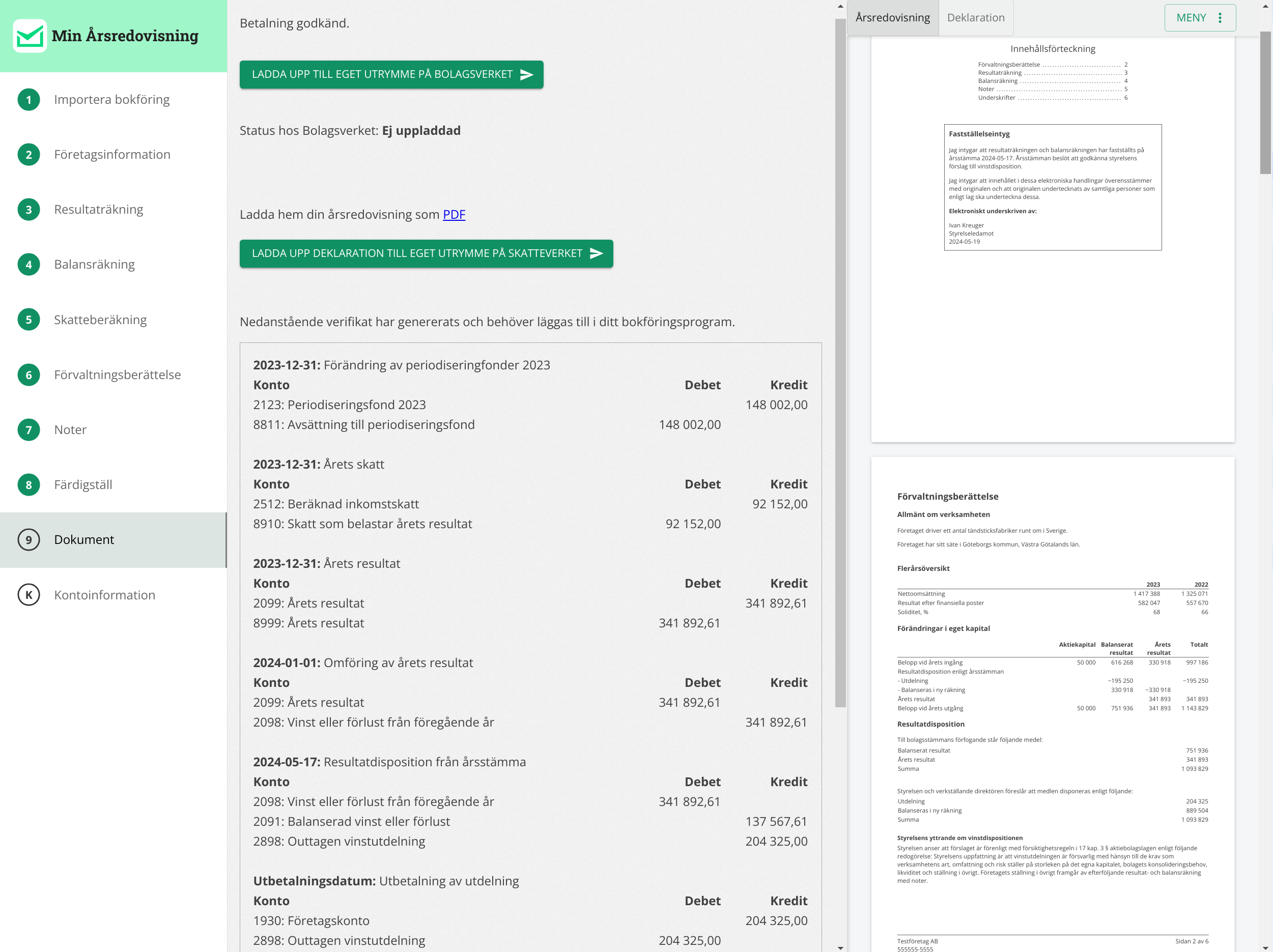 Här kan du ladda hem din årsredovisning som PDF, skicka in digitalt till Bolagsverket/Skatteverket. Du får även hjälp med hur dom ska bokföra årets skatt/resultat och din resultdisposition.