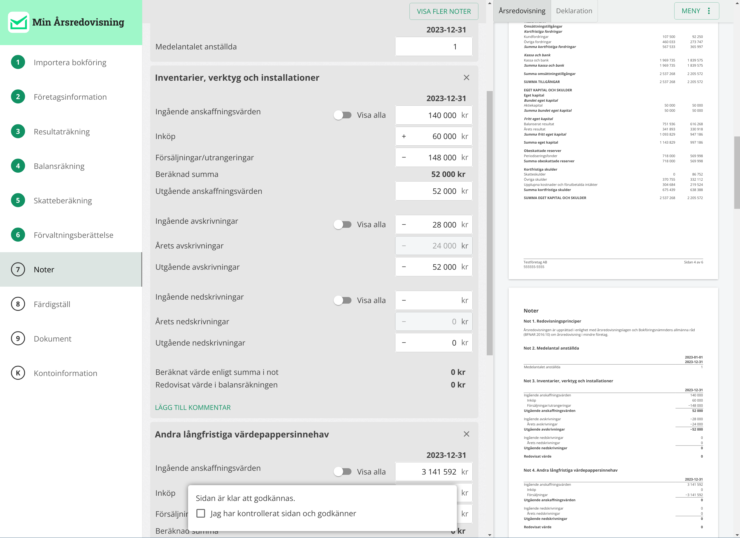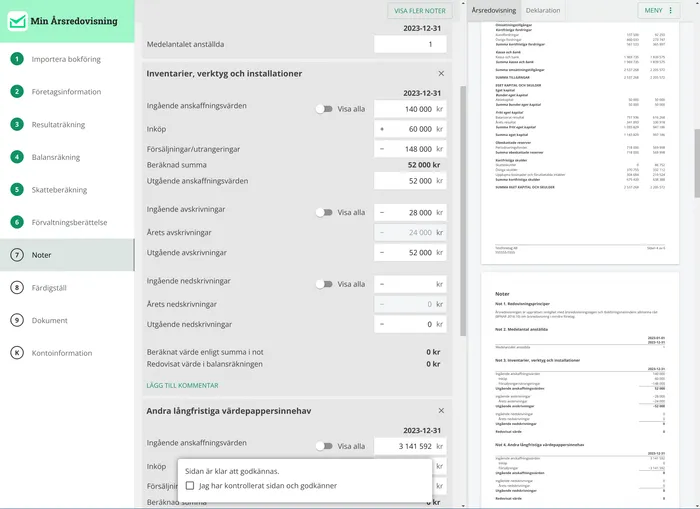 Här fyller du i information om redovisningsprinciper, samt mer detaljerad information om vissa poster i resultat- och balansräkningen. Ju fler poster du har ju fler notera behöver du fylla i. Till exempel, om du har “Maskiner och andra tekniska anläggningar” i din balansräkning så kommer programmet automatiskt infoga en not för detta där du behöver ange bland annat inköp, försäljningar och avskrivningar.