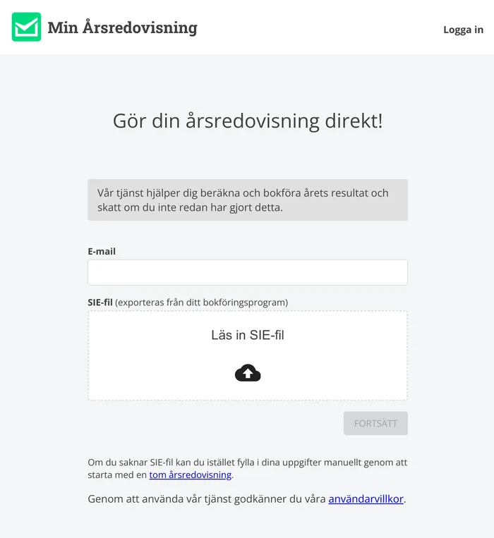 Om du inte har en SIE-fil tillgänglig kan du istället klicka på länken “starta med en tom årsredovisning” nedanför formuläret och endast fylla i ditt organisationsnummer. Att starta utan SIE-fil innebär betydligt mer arbete för användaren och ökar risken för fel. Om du har problem med att exportera din SIE-fil är det bättre att du kontaktar oss så hjälper vi dig.